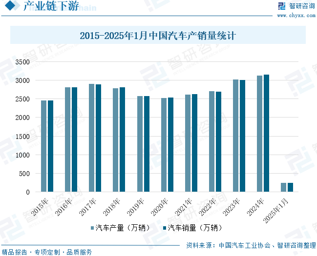 汽车工业作为激光加工设备制造行业的下游应用领域之一,其庞大的产业规模和对精密制造的高要求为激光加工技术提供了广阔的应用空间。在汽车制造过程中,激光加工技术被广泛应用于车身焊接、表面处理、零部件切割等关键工艺环节。尤其在新能源汽车快速发展的背景下,激光加工在动力电池焊接、轻量化材料加工等新兴领域展现出独特优势。中国汽车工业协会数据显示,2015-2017年中国汽车工业产销量逐年增长,2018年以来,受购置税优惠政策全面退出、宏观经济增速回落等因素的影响,我国汽车产业面临较大的压力。特别是2020年疫情的突发,进一步加剧了汽车行业困境,导致汽车产销两端承压,产业链供应链受到严重冲击,产销量分别下降至2522.5万辆和2531.1万辆。2021年以来,供应端芯片供应不足、原材料价格高位运行等问题逐步改善,中国汽车产销量开始恢复增长。2024年,中国汽车产销量分别完成3128.2万辆和3143.6万辆,同比分别增长3.7%和4.5%。2025年1月,中国汽车产销量分别完成245万辆和242.3万辆,产量同比增长1.7%,销量同比下降0.6%。随着汽车产销量的持续增长,对激光加工设备制造行业的精度、效率和可靠性提出了更高的要求,进一步推动了激光加工技术的创新发展。
