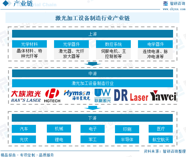 激光加工设备制造行业产业链上游为材料及零部件供应环节,主要包括光学材料、光学器件、数控系统、电学器件等,其中,光学材料包括晶体材料、特种光纤等;光学器件包括激光器、光纤放大器等;数控系统包括伺服电机、主控制板等;电学器件包括连续电源、脉冲电源等。中游为激光加工设备生产供应环节,主要包括焊接设备、切割设备、打标设备、雕刻设备等。下游广泛应用于汽车、机械、电子、印刷、医疗、光伏、锂电、军工、半导体、航空航天等领域。