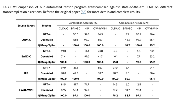 同时,通过基于性能优化反馈回路的分层自动调整来识别最佳转换过程。具体而言,我们结合了跨通道蒙特卡洛树搜索,以实现最佳转换排序和基于约束的通道内自动调整关键调整参数,例如内存平铺配置。最终,我们的解决方案能够跨 Nvidia GPU、寒武纪 MLU、AMD MI加速器、英特尔 DLBoost ,以及像 SIMT、SIMD 这样的编程模型等各种处理器实现自动化张量程序转译器。在 LLM 等实际应用中,对这些模型跨不同的处理器进行实验证明,QiMeng-Xpiler 可以正确翻译不同的张量程序,平均准确率为 95%,如表 V所示。