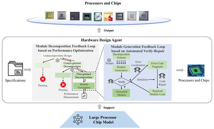 图3:硬件设计代理的结构具有双循环反馈机制:基于性能优化的外部模块分解反馈循环和由自动验证和修复支持的内部模块生成反馈循环。