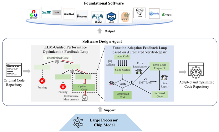 因此,硬件设计代理实现了一个完全集成的跨阶段协同设计范式,有望超越传统的人工设计,在相同的制造工艺下实现卓越的性能。同时,软件设计代理也采用双循环机制,由LLM引导的外部性能优化反馈循环和基于自动验证和修复的内部功能适配反馈循环组成。软件设计代理自主实现目标处理器芯片基础软件的无缝功能适配和性能优化,满足现代应用不断变化的需求。