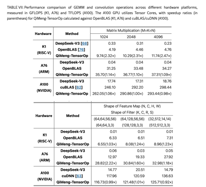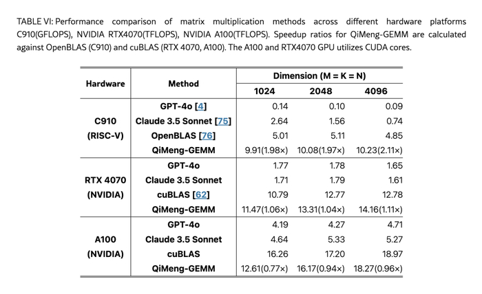 我们已经在玄铁C910开发板、MuseBook (K1) ,ARM A76 和 NVIDIA GPU(RTX 4070 [87]、RTX 8000 ,T4 和A100等不同平台上验证了这些方法,见表六、表七和表八。在RISC-V平台上,QiMeng-GEMM和QiMeng-TensorOp生成的高性能矩阵乘法算子分别可以达到OpenBLAS性能的211%和251%。在NVIDIA平台上,它们分别可以达到cuBLAS性能的115%和124%。