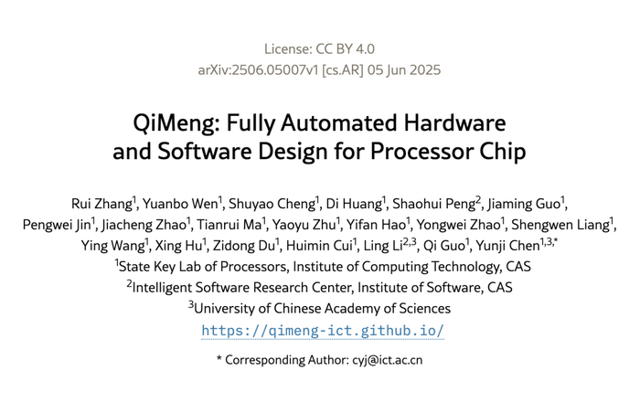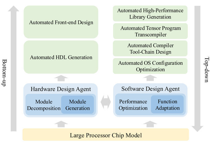 本文提出了一种全新的处理器芯片软硬件全自动设计系统——QiMeng。QiMeng 包含三个层次。在底层,我们构建了一个面向特定领域的大型处理器芯片模型 (LPCM: Large Processor Chip Model),在架构、训练和推理方面引入了新颖的设计,以应对知识表示缺口、数据稀缺、正确性保证以及巨大的解空间等关键挑战。