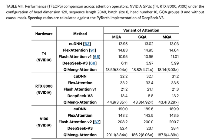与传统的LLM快速方法相比,我们的方法显著提高了生成代码的性能,提高了开发效率。为了验证Qimeng-Attention的性能,我们在各种NVIDIA硬件架构上进行了实验。在NVIDIA T4平台和NVIDIA RTX8000平台上,Qimeng-Attention生成的高性能注意算子与所有四种实现相比始终具有优异的性能指标。