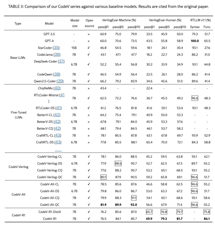 2) 受到数学和软件编码任务中展示的推理能力的启发,我们提出了几项创新:基于规则的测试平台生成器,可根据黄金参考验证预测代码;往返数据合成方法,仅使用源代码片段作为输入即可生成高质量的自然语言代码对;自适应 DAPO,DAPO 的快速版本,根据过去的样本丢弃率动态调整每步的样本数量。这些组件被集成到一个“先提取后强化学习”的两阶段训练流水线中,以开发 CodeV-R1,一个具有推理增强功能的 Verilog 生成 LLM,具有思考能力和测试时间扩展能力。如表 三所示,CodeV-R1 在 VerilogEval v2 和 RTLLM v2 上分别实现了 68.6% 和 72.9% 的 pass@1 率,比之前最先进的模型高出 12% 到 21%,并且匹敌甚至超过了 671B 的 DeepSeek-R1 的性能。