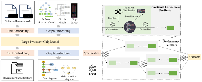 虽然LPCM具备处理图信息的领域专业知识和跨阶段协同设计的能力,但上下文长度限制和幻觉等挑战阻碍了LPCM实现无缝的端到端处理器芯片设计以及基础软件的适配和优化。为了确保生成的处理器芯片软硬件的正确性和高性能,必须开发一种反馈驱动的LPCM推理机制,以促进有效的设计规划、利用外部功能验证工具并通过反馈优化性能。具体而言,反馈驱动的推理可以分为两类:功能正确性反馈和性能反馈,如图2右所示。LPCM通过双循环机制执行这两个反馈,包括外部性能反馈循环和内部功能正确性反馈循环。