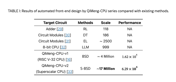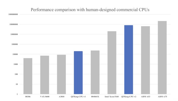 图5:在 ARM 官方 CPU 基准测试 Dhrystone 上,QiMeng-CPU 系列(蓝色)与人工设计的商用 CPU(灰色)的性能对比。结果显示,QiMeng-CPU-v1 的性能与 Intel 486(20 世纪 90 年代的 CPU)相当,而 QiMeng-CPU-v2 的性能与 Arm Cortex A53(2010 年代的 CPU)相当。