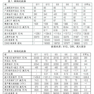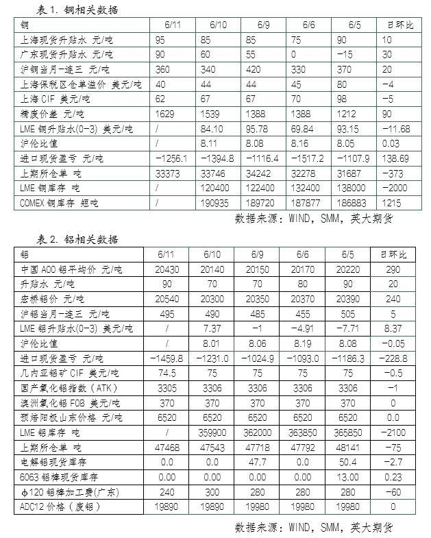 铝现货市场方面,据SMM讯,华东地区在途货源预期较少,现货市场超低库存状态,且有大户于市场高升水收货,市场货源偏紧,持货商借机高挺升水。6月11日,SMM A00铝报20400元/吨,较上一交易日涨240元/吨,对06合约升水90元/吨,较前一交易日涨20元/吨。中原市场,货源并不紧张,日内随着铝价重心不断上移,市场出货量开始增长。总的来看,经贸谈判继续释放利好消息,提振铜铝价格反弹。但关税政策的不确定性对多头热情仍有抑制。铜方面,消费淡季下需求走弱,但到货偏少,且当前库存水平较低,对铜价仍有支撑。铝方面,国内铝水比例提升影响铸锭量,近期铝锭到货仍偏少,但消费仍有韧性,铝锭大幅去库,对铝价具有较强支撑。消费淡季需求持续走弱,关注消费端及库存变化情况。