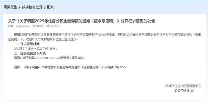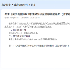 6月11日,天津市住房公积金管理中心发布关于《关于调整2025年住房公积金缴存额的通知(征求意见稿)》公开征求意见的公告,其中提出: