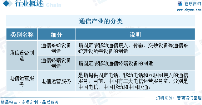 通信是指是人与人或人与自然之间通过某种行为或媒介进行的信息交流与传递,从广义上指需要信息的双方或多方在不违背各自意愿的情况下无论采用何种方法,使用何种媒质,将信息从某方准确安全传送到另一方。通信产业是指:由从事通信设备和系统及相关的配套设备、专用零部件的研究、生产、开发单位,以及电信运营服务商组成的产业集群。通信产业可以细分为通信设备制造业和电信运营服务业两个细分行业。其中,通信设备制造业包括通信系统设备制造和通信终端设备制造。
