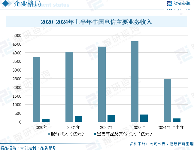 中国电信股份有限公司坚持基础业务和产业数字化业务双轮驱动,加快战新业务发展,不断提升数字化智能化绿色化产品服务能力。持续推动基础业务转型升级,不断优化5G网络覆盖和服务品质,通过AI赋能强化5G应用创新和推广;持续推进FTTR升级和千兆应用拓展,不断丰富智家应用和权益,打造绿色产品助力美好低碳新生活;持续强化数字乡村、智慧社区、视联网等CHBG融通应用拓展,加快平台AI升级和内容填充,做大数字平台业务和基础连接规模。持续推进产业数字化业务快速发展,加强数字平台技术研发与能力创新,着力打造110余个核心数字化平台规模赋能政务、工业、教育、医疗、金融等十余个重点行业客户数字化转型升级。持续加快战略新兴业务规模发展,围绕“云计算及算力、新一代信息通信、大数据、人工智能、安全、量子、数字平台”七大战略新兴业务,加快培育和发展新质生产力,量质并重、全面推进云电脑、量子密话密信、视联网、手机直连卫星等重点产品发展,深化布局、积极加快“网+云+AI+应用”与传统产业深度融合,不断为公司高质量经营发展注入新动能新优势。数据显示,2024年上半年,中国电信服务收入为2462亿元,同比增长4.32%;出售商品及其他收入为197.38亿元,同比下降13.06%。