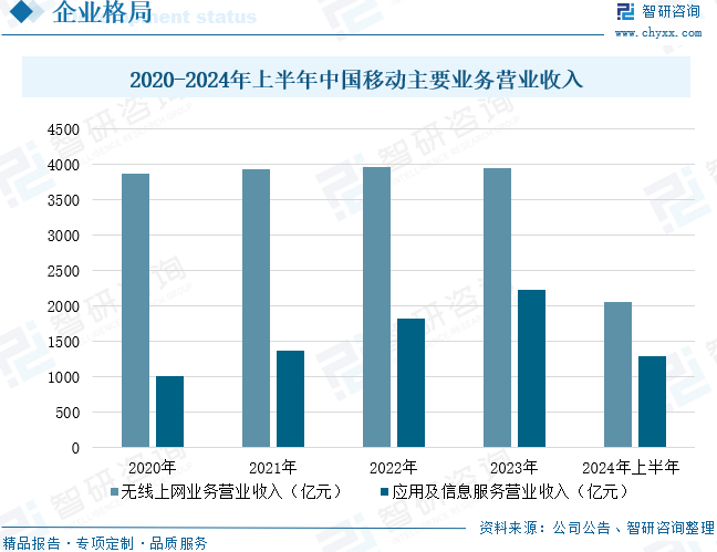 中国移动有限公司是一家基于GSM、TD-LTE、FDD-LTE制式网络的移动通信运营商。公司在国内31个省(自治区、直辖市)和香港设立全资子公司,并在香港和纽约上市,主要经营移动语音、数据、宽带、IP电话和多媒体业务,并具有计算机互联网国际联网单位经营权和国际出入口经营权。数据显示,2024年上半年,中国移动无线上网业务营业收入为2051亿元,同比下降3.16%;应用及信息服务营业收入为1290亿元,同比增长10.82%。