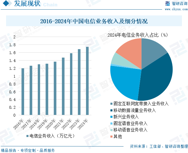 2024年,我国通信业全面贯彻党的二十大和二十届二中、三中全会精神,认真落实全国新型工业化推进大会部署要求,全行业实现稳步增长,高质量发展扎实推进,5G、千兆光网等网络基础设施进一步完善,各项应用普及持续深化,为促进实体经济和数字经济深度融合夯实根基,为制造强国、网络强国和数字中国建设注入强大动力。2024年电信业务收入累计完成1.74万亿元,同比增长3.2%。2024年,完成固定互联网宽带接入业务收入2763亿元,同比增长5.5%,在电信业务收入中占比由2023年的15.6%提升至15.9%。2024年,完成移动数据流量业务收入6289亿元,同比下降1.5%,在电信业务收入中占比由2023年的37.9%降至36.2%。2024年,完成包括云计算、大数据、移动物联网、数据中心等在内的新兴业务收入4348亿元,同比增长10.6%,在电信业务收入中占比由2023年的21.6%提升至25%。2024年,完成固定语音和移动语音业务收入176.1亿元和1093亿元,比2023年分别下降4.9%和1%,两项业务合计占电信业务收入的7.3%,占比较2023年回落0.4个百分点。通信业的稳步增长和网络基础设施的完善为通信大数据的发展提供了坚实基础。5G、千兆光网的普及以及新兴业务的快速增长,显著扩大了数据规模和应用场景,为通信大数据的采集、分析和价值释放创造了更多机会。