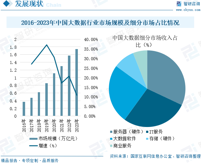 大数据,也被称为巨量资料或海量数据,指的是规模巨大到无法利用传统的数据处理技术在合理的时间内获取、存储、管理和分析的数据集合。大数据通常具备体量大、多样化及速度快的特征。大数据行业的发展得到了各级政府和相关部门的大力政策支持。这些政策旨在推动大数据产业的创新和发展,促进经济社会数字化转型。中国大数据产业规模在近年来实现了快速增长。中国大数据市场规模已经连续几年保持高速增长,增速远超全球平均水平。这主要得益于政府对大数据产业的重视和支持,以及各行业对大数据应用需求的不断增长。国家互联网信息办公室发布《国家信息化发展报告(2023年)》。《报告》显示2023年,我国大数据产业规模达1.74万亿元,同比增长10.45%,未来市场空间巨大。从细分市场来看,目前大数据产业主要包括服务器(硬件)、IT服务、大数据软件、存储(硬件)、商业服务等,其中,大数据软件占比高达25%。大数据产业规模的增长为通信大数据行业提供了更强大的技术支撑和市场空间,推动数据采集、处理和应用能力的提升。