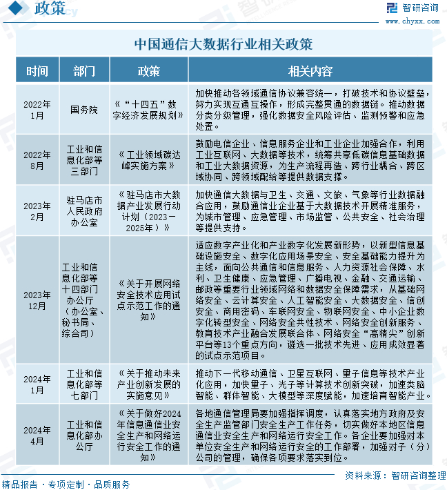 近年来,国家出台了一系列通信大数据行业相关政策,旨在促进行业的健康、快速发展,推动数字经济与实体经济的深度融合。例如,2024年1月,工业和信息化部等七部门印发《关于推动未来产业创新发展的实施意见》,提出要推动下一代移动通信、卫星互联网、量子信息等技术产业化应用,加快量子、光子等计算技术创新突破,加速类脑智能、群体智能、大模型等深度赋能,加速培育智能产业。2024年4月,工业和信息化部办公厅印发《关于做好2024年信息通信业安全生产和网络运行安全工作的通知》,提出各地通信管理局要加强指挥调度,认真落实地方政府及安全生产监管部门安全生产工作任务,切实做好本地区信息通信业安全生产和网络运行安全工作。各企业要加强对本单位安全生产和网络运行安全的工作部署,加强对子(分)公司的管理,确保各项要求落实到位。