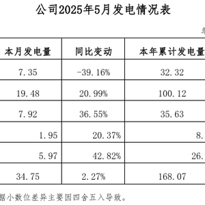 北极星电力网获悉,6月11日,湖北能源公告称,2025年5月,公司完成发电量34.75亿千瓦时,同比增加2.27%。其中水电发电量同比减少39.16%,火电发电量同比增加20.99%,新能源发电量同比增加36.55%。