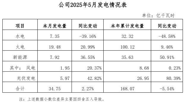 公司本年累计完成发电量168.07亿千瓦时,同比减少5.54%。其中水电发电量同比减少48.58%,火电发电量同比增加9.46%,新能源发电量同比增加50.91%。