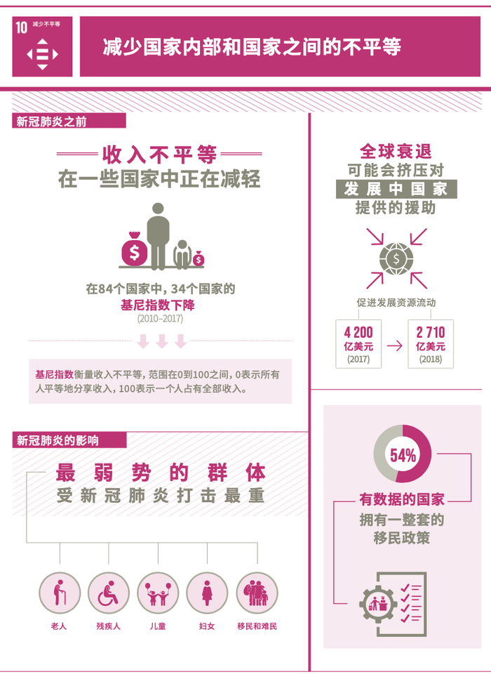 大流行病造成了三十年来国家间最严重的不平等。要减少国家内部和国家之间的不平等,就必须公平分配资源,投资于教育和技能发展,落实社会保障措施,反对歧视,支持边缘化群体,促进公平贸易和金融体系方面的国际合作。