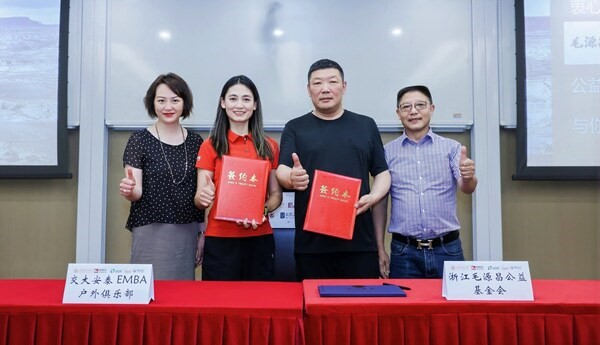 6月5日毛源昌公益基金会x交大安泰商学院签约现场 从左至右:交大安泰EMBA中心副主任钟晓清 交大安泰户外协会会长高志双 浙江毛源昌公益基金会秘书长陈言勇 浙江毛源昌公益基金会副理事长杨圣桂