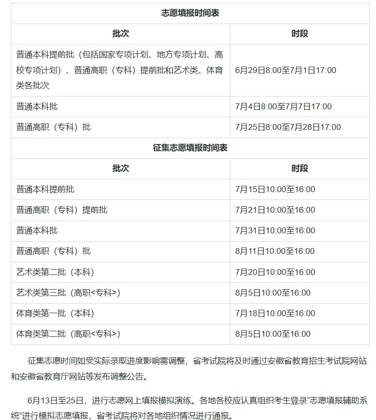 6月25日至30日:填报本科提前批(A、B 段)、本科批(A、B 段)志愿、高职(专科)提前批(A、B、C 段)志愿。