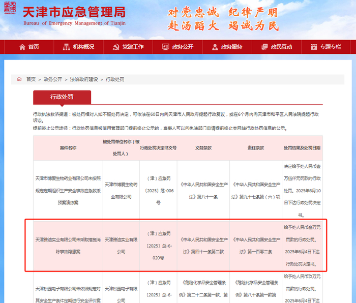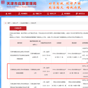 对此,天津市应急管理局对其做出如下行政处罚:给予处人民币叁万元罚款的行政处罚。2025年6月4日下达行政处罚决定书。