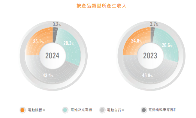分产品来看,电动自行车收入占比43.4%,销量约908.9万台,同比降约21.4%;电动踏板车收入占比约25.1%,销量约393.1万台,同比降约20.7%。换算后,雅迪控股在2024年的每辆两轮电动车价格约为1487元,据了解,这一数据在2023年为1485元,变化不明显。