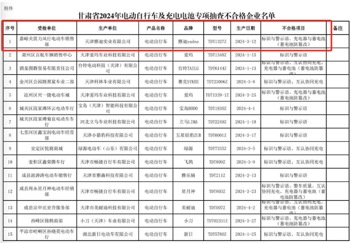 这不是天津雅迪实业有限公司第一次“榜上有名”,2024年6月21日,甘肃省市场监督管理局通报了15批次电动自行车产品质量不符合标准要求,“雅迪”“台铃”“新日”等上榜,不合格项目为标识与警示语、充电器与蓄电池(蓄电池防篡改),生产单位为天津雅迪实业有限公司。