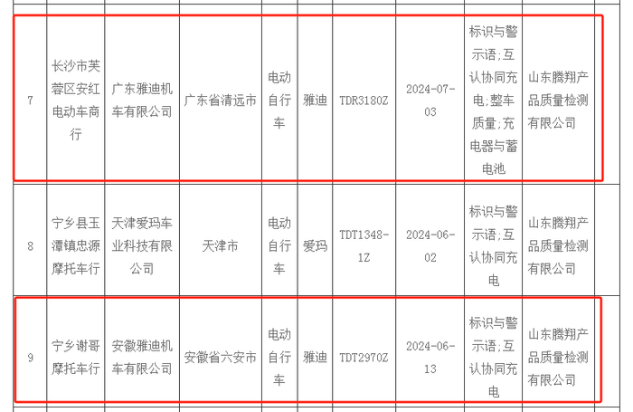 此外,在同年10月9日,湖南长沙市市场监管局通告了14批次抽检不合格电动自行车,涉及“雅迪”“爱玛”“绿源”“小刀”等品牌。在产品质量监督抽查不合格名单中,“雅迪”有3批次产品抽检不合格,标称生产者为广东雅迪机车有限公司和安徽雅迪机车有限公司。