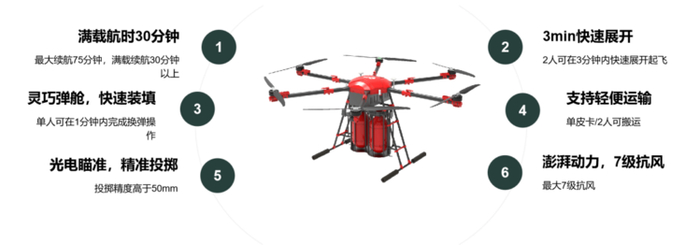 ● ZMD60无人机支持集群控制与5G联网,具备7级抗风能力,可执行物资运输、精准投弹等任务;