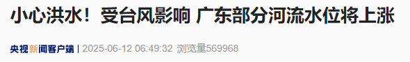 据央视新闻,受今年第1号台风“蝴蝶”影响,6月13日—15日,广东省有一次暴雨到大暴雨局部特大暴雨过程,广东省江河将出现2-6米左右的涨水过程。其中,北江、东江、韩江、鉴江等主要江河将出现明显涨水,部分江河支流和中小河流将超过警戒水位,个别中小河流可能发生洪水。