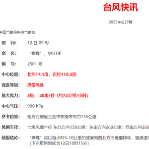 今天(12日)9时,台风“蝴蝶”中心距离海南省三亚市东南方向约155公里,也就是北纬17.1度、东经110.3度,中心附近最大风力8级(20米/秒),中心最低气压990百帕。