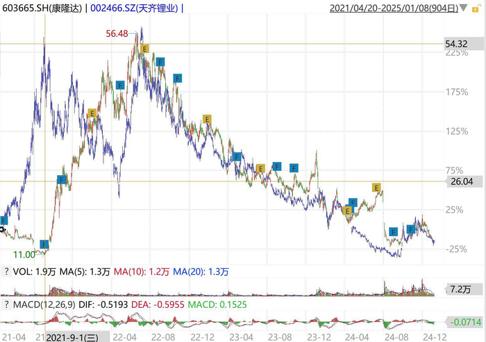 然而第二次收购天成锂业17.67%股份时,碳酸锂现货价已经超过了50万元/吨,已经是人声鼎沸阶段,而聪明的资本市场已经通过天齐锂业的股价提前两个季度预演了碳酸锂未来的供过于求,可以说这个时候的康隆达就是韭菜行为了。