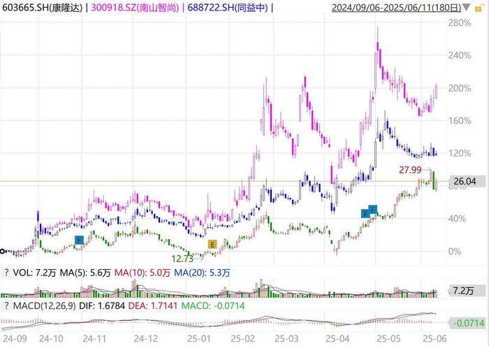 从下图中能够清晰的看到,2025年以来,康隆达的股价走势,与另外两个腱绳核心标的南山智尚、同益中高度趋同,尽管康隆达在股价涨幅上落后另外两家,但年初至今也大涨了84.42%,从年内低点算起也实现了翻倍。