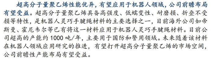根据部分券商组织的专家交流纪要信息,在众多的高分子纤维材料中,“超高分子量聚乙烯纤维”凭借其优异的性能,成为了当前腱绳材料的主流选择,然而讽刺的是,康隆达本次公告中计划终止的就是“高性能高强高模聚乙烯纤维”项目,终止的理由的产能过剩和行业竞争加剧。换句话说,人形机器人距离大规模放量还很远,腱绳作为资本市场上的题材炒作没有问题,至于什么时候能贡献业绩,或许没有人能知道。