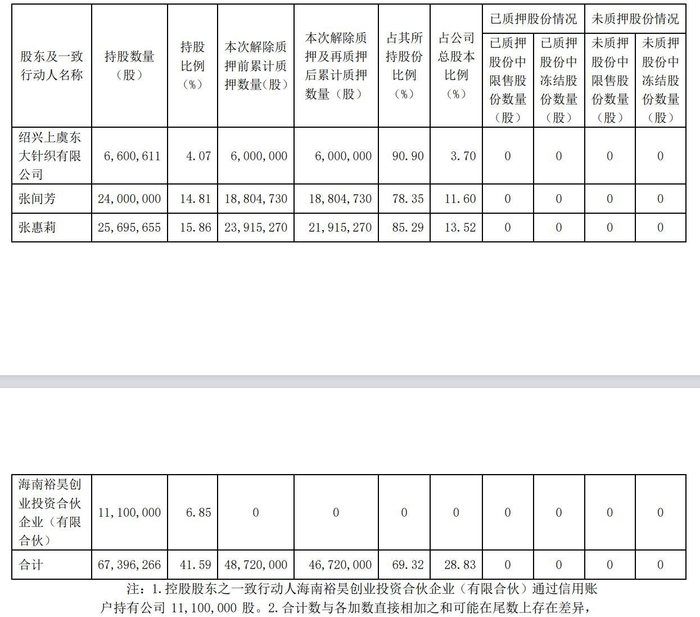流动性紧张的不只是康隆达,还有康隆达的实际控制人。根据2025年1月22日的质押公告,实控人及一致行动人的股份质押比例普遍非常高,甚至超过90%。而作为一致行动人之一的绍兴上虞东大针织有限公司,在一年前不到的2024年9月,就曾因股价连续4个跌停后,被迫向质权人平仓1,661万股,占公司总股本的10.25%,同时东大针织也失去第一大股东的地位。