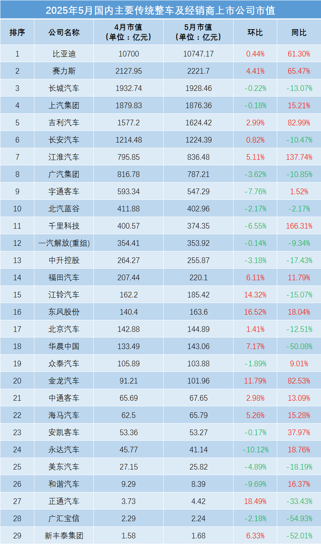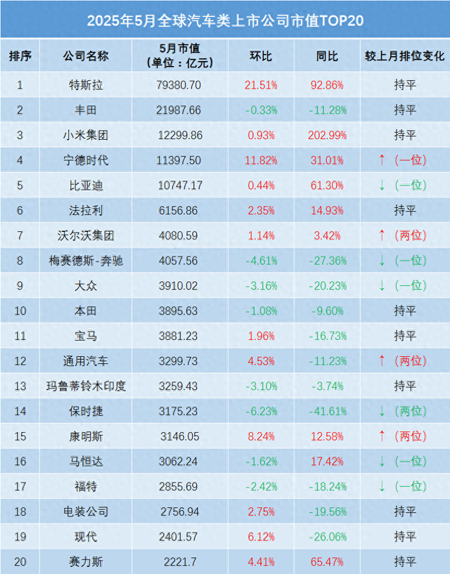 2025年5月《中国汽车报》汽车市值研究组继续对全球汽车类上市公司月度市值变化进行全面跟踪、梳理和比较分析。并基于2024年全年的数据积累基础上,对全球汽车类上市公司的年度市值表现进行总结,并对2025年市值变化趋势进行预判。为读者提供更丰富、更详实、更客观、更多元、多维度的市值变化数据分析。