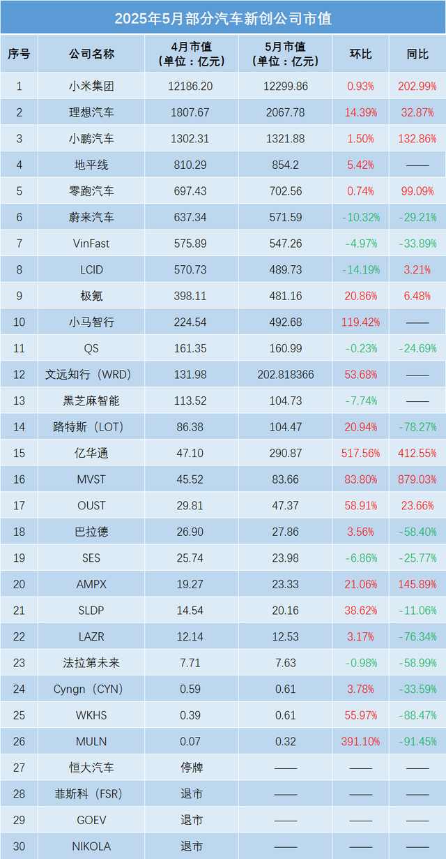 同为造车新势力的Rivian表现也不错,5月市值环比小幅增长,同比涨幅则接近50%。原因之一是其财报有所好转。5月上旬,该公司发布的数据显示,今年第一季度,其营收同比增长3%至12.4亿美元;毛利润为2.06亿美元,较去年同期的5.27亿美元毛亏损显著改善,且连续第二个季度实现毛利润;净亏损为5.41亿美元,较去年同期14.46亿美元的净亏损大幅收窄。Rivian首席执行官斯卡林格表示,因Rivian实现连续两个季度毛利润达标,大众集团预计将于今年6月底对Rivian投资约10亿美元。一系列利好消息刺激Rivian股价上涨。