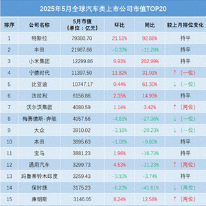 从2025年5月全球汽车类上市公司市值前20的排名看,实现市值同比增长的企业为9家,环比增长的企业为12家,与4月整体表现趋同。排位方面,头部阵营持续呈现波动,5月市值排名前20的企业中有10家排位与4月相比有所变化。其中,仅有4家企业排位上升,6家下降。