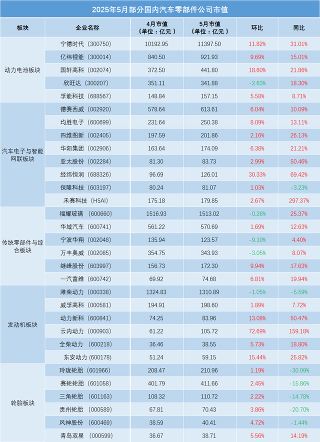 传统零部件板块在电动化转型压力下,呈现 “龙头企稳、中小企承压” 的格局。福耀玻璃作为全球汽车玻璃龙头,5月市值1513.02亿元,环比微降0.26%,同比增长25.37%,展现出较强抗风险能力。发动机板块在新能源替代趋势下持续承压,但头部企业通过多元化转型缓解压力。