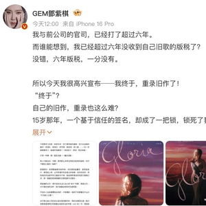 邓紫棋写道,15岁那年,一个基于信任的签名,却成了一把锁,锁死了我与自己的音乐“孩子”重逢的机会。往回走一步,我竟走了六年。希望所有听我音乐的朋友, 能支持这一张《 I AM GLORIA 》重录专辑, 支持一位创作者奋力地重新发出声音, 支持一位母亲竭力地把”孩子”寻回身边! 这不是一个复仇的故事,而是一个死而复活、失而复得的故事!