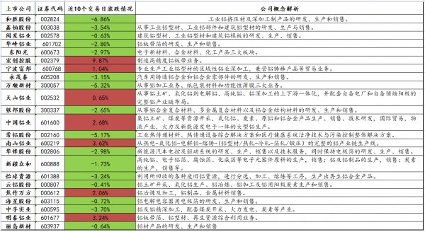 铝关联股票:工业金属(881168)、和胜股份(002824)、鑫铂股份(003038)、闽发铝业(002578)、华峰铝业(601702)、东阳光(600673)、宏创控股(002379)、宁波富邦(600768)、永茂泰(605208)、万顺新材(300057)、天山铝业(002532)、银邦股份(300337)、中国铝业(601600)、常铝股份(002160)、南山铝业(600219)、华锋股份(002806)、新疆众和(600888)、怡球资源(601388)、云铝股份(000807)、焦作万方(000612)、海星股份(603115)、中孚实业(600595)、明泰铝业(601677)、宁波富邦(600768)、天奇股份(002009)、盛屯矿业(600711)