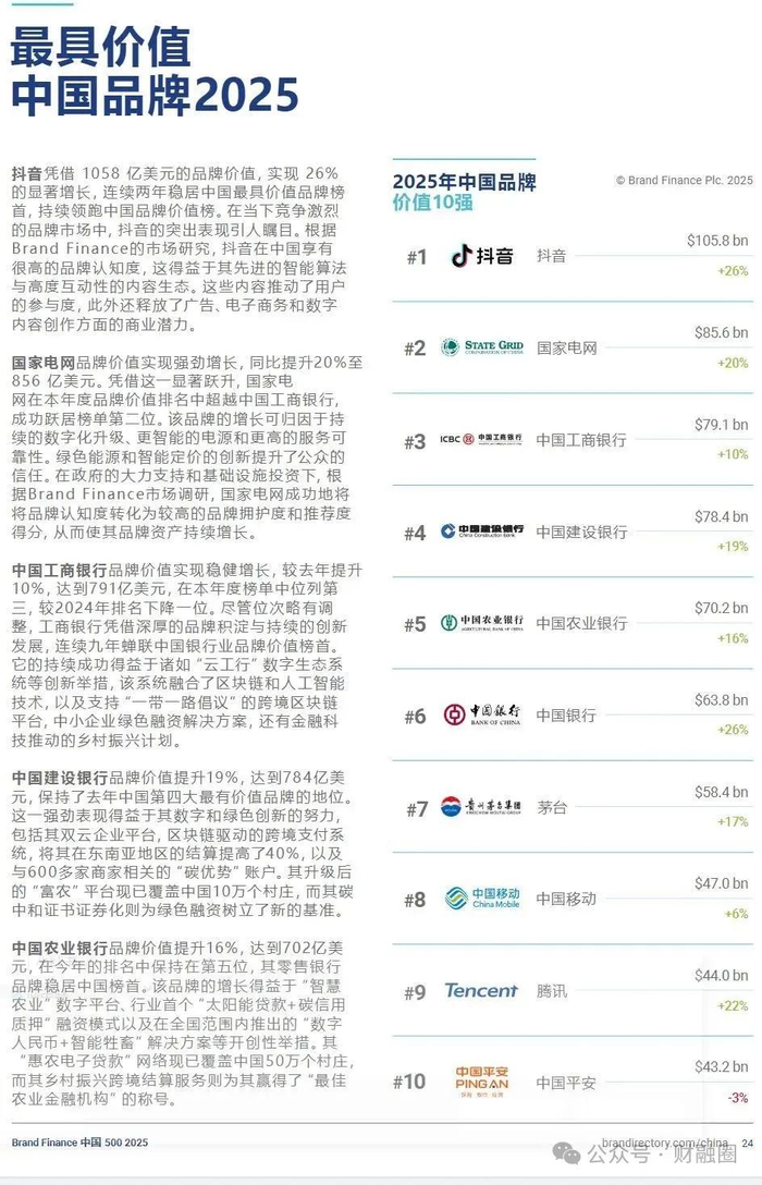 第六至十名依次为中国银行(638亿美元)、茅台(584亿美元)、中国移动(470亿美元)、腾讯(440亿美元)和中国平安(432亿美元),其中腾讯增长显著(22%),而中国平安是前十中唯一价值下降的品牌(-3%)。