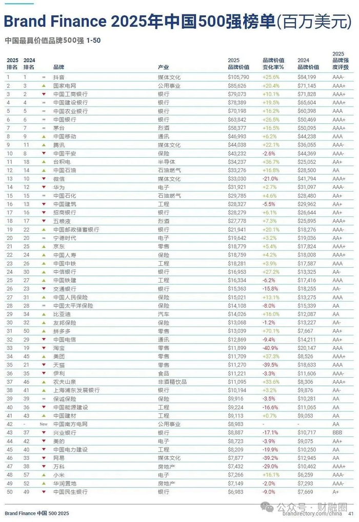 近日,国际知名品牌价值评估咨询机构Brand Finance发布“2025中国品牌价值500强”榜单 。