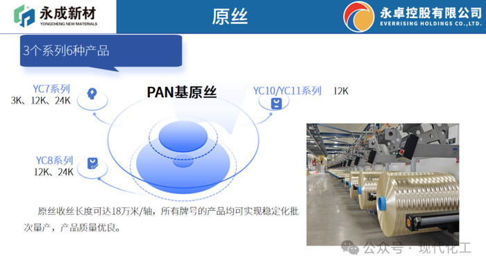 公司拥有完全自有的自主知识产权工艺包、世界尖端的工艺设备、成熟先进的高性能碳纤维制备技术,主要产品为T700、T800、T1000、T1100高性能碳纤维,规格为3K-24K。