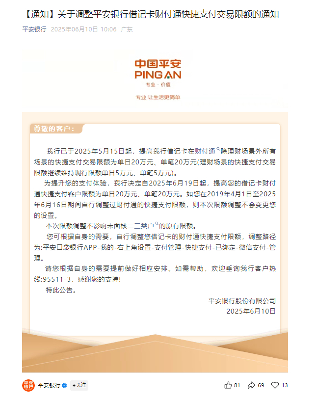 6月10日,平安银行在官方微信公众号发布了关于调整平安银行借记卡财付通快捷支付交易限额的通知。在通知中,平安银行表示,该行已经于2025年5月起,提升该行借记卡在财付通除理财场景外所有场景的快捷支付交易限额为单日、单笔20万元。
