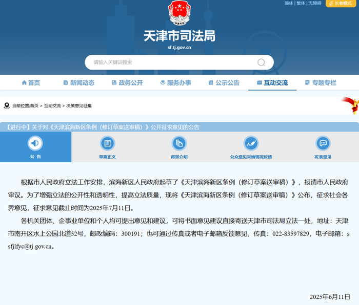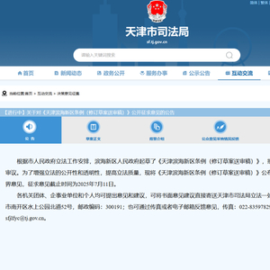 根据市人民政府立法工作安排,滨海新区人民政府起草了《天津滨海新区条例(修订草案送审稿)》,报请市人民政府审议。为了增强立法的公开性和透明性,提高立法质量,现将《天津滨海新区条例(修订草案送审稿)》公布,征求社会各界意见,征求意见截止时间为2025年7月11日。