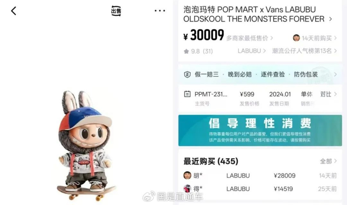 泡泡玛特旗下潮玩IP“LABUBU”的二级市场价格持续飙升——发售价599元的Vans联名款玩偶如今在“得物”平台上标价约3万元;一款标注为初代收藏级薄荷色的LABUBU玩偶近日更在拍卖会上以108万元成交。