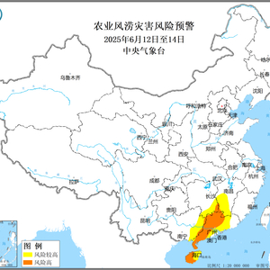 台风带来的强风雨天气可能导致局地作物受淹、部分抽穗早稻“雨洗禾花”,经济林果折枝落果,农渔业设施受损。预计6月12-14日,广西东部、广东中部、江西西南部、湖南东南部、海南东部等地农业大风洪涝灾害风险较高;海南中西部、广东西部等地农业大风洪涝灾害风险高(图1)。