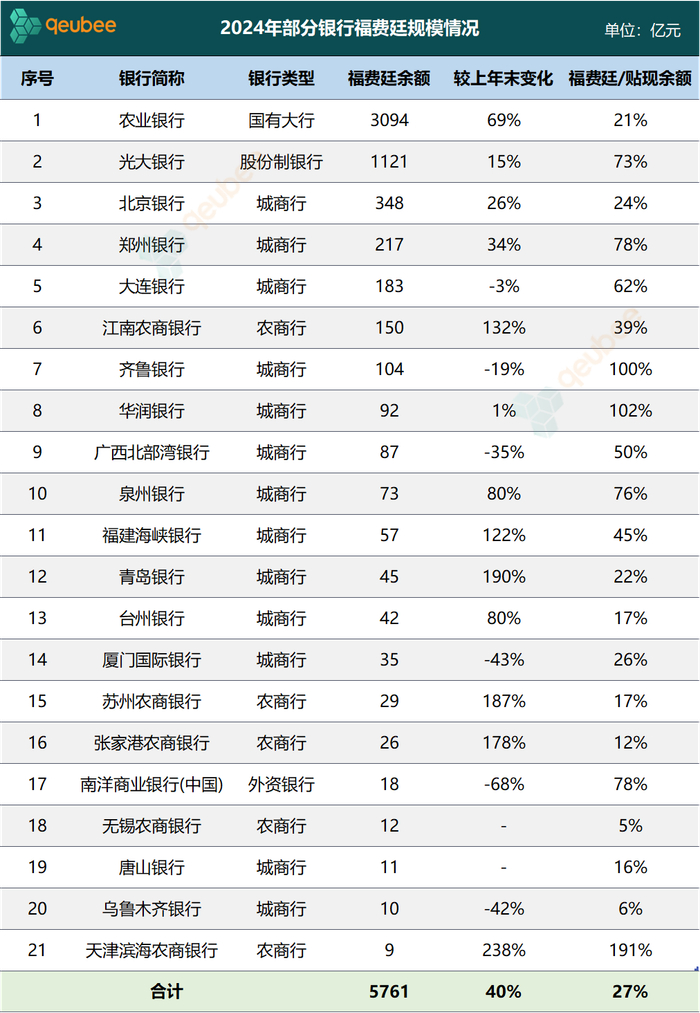 由于目前鲜有福费廷市场规模数据,我们只能通过部分银行的福费廷数据来管中窥豹。根据qeubee对21家银行的统计,2024年末,这21家银行福费廷余额合计5761亿元,较上年末增长40.2%,作为对比,同期这21家银行票据贴现余额增长14.6%,福费廷规模增速明显高于票据贴现规模。