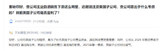 对此,该消息一出,有投资者立马在互动平台对天佑德酒发出质疑:贵公司主业白酒销售下滑这么明显,还继续注资美国子公司,贵公司是出于什么考虑的?目前美国子公司是否盈利了?